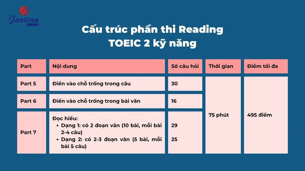 Cấu trúc phần thi Reading TOEIC 2 kỹ năng