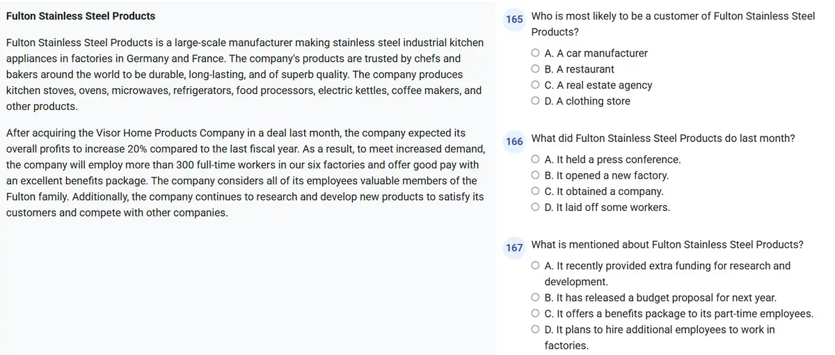 • Nếu gặp câu hỏi khó, đừng để bị áp lực. Hãy đọc lại thật kỹ và phân tích từng lựa chọn một cách logic – đây là kỹ năng rất quan trọng khi luyện thi TOEIC 2 kỹ năng ở trình độ trung – cao.