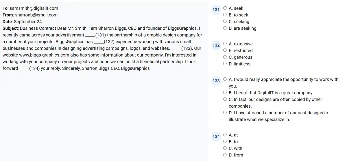 Với phần Reading Part 6 trong bài thi TOEIC 2 kỹ năng gồm 4 đoạn văn có 16 câu hỏi. Các thí sinh sẽ phải chọn từ hoặc cụm từ phù hợp để hoàn thành câu hoặc đoạn văn. Đoạn văn có thể là thư từ, email, thông báo hoặc tài liệu trong môi trường làm việc. Trong quá trình luyện thi TOEIC 2 kỹ năng, việc làm quen với những dạng văn bản này giúp người học TOEIC 2 kỹ năng cải thiện khả năng đọc hiểu nhanh và chọn lọc thông tin chính xác hơn.