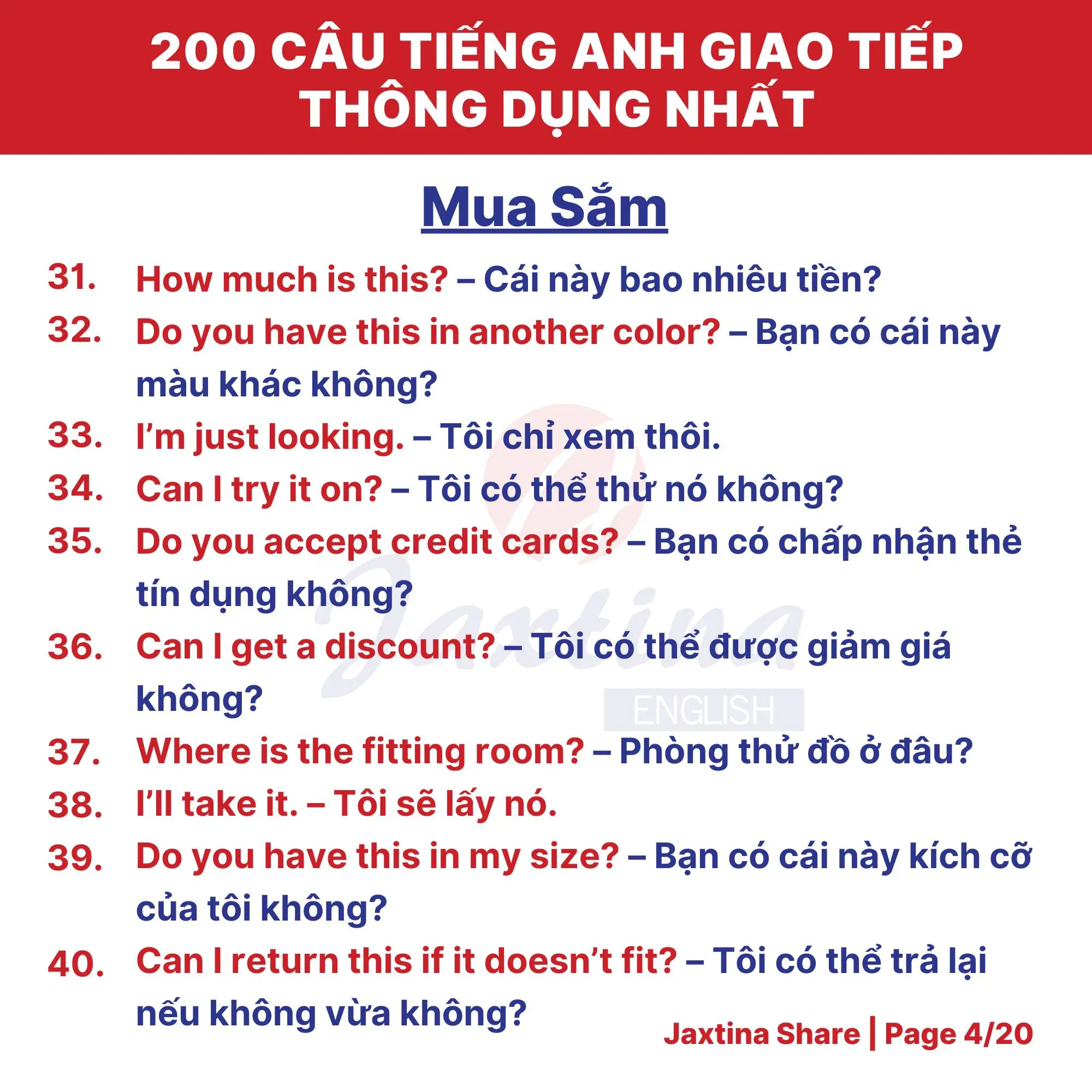 Trong các khóa học tiếng Anh giao tiếp cơ bản hàng ngày, chủ đề “đi mua sắm” thường được lồng ghép vào bài học vì đây là tình huống rất phổ biến trong thực tế. Dưới đây là những mẫu câu bạn nên luyện khi học nói tiếng Anh giao tiếp hoặc tham gia các lớp dạy tiếng Anh giao tiếp để áp dụng ngay trong đời sống.