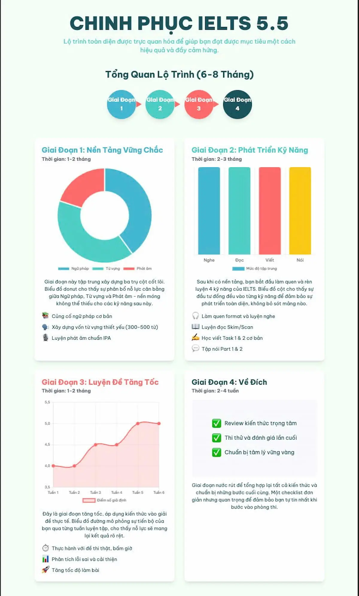 Lộ trình học tổng quan từ 0 lên 5.5 được chia thành 4 giai đoạn chính: