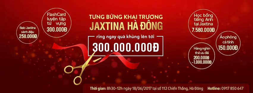 8h30 – 12h Ngày 18 tháng 6, Jaxtina Hà Đông sẽ chính thức khai trương tại địa chỉ Số 112 Chiến Thắng, Hà Đông, Hà Nội. Đây là cột mốc đánh dấu chặng đường 5 năm hình thành và phát triển không ngừng của Jaxtina English Center.