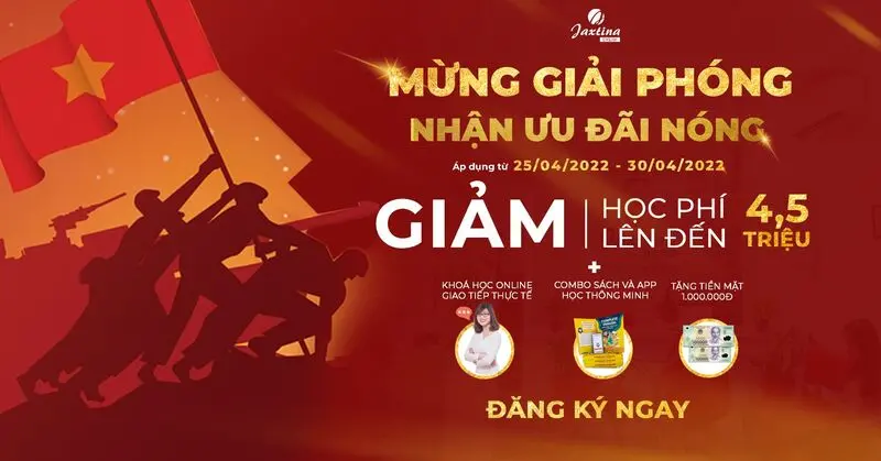 Hòa trong không khí tưng bừng chào mừng ngày Giải phóng miền Nam thống nhất đất nước 30/4 và ngày Quốc tế lao động 1/5 , Hệ thống Anh ngữ Jaxtina dành tặng ƯU ĐÃI ĐẶC BIỆT cho tất cả khách hàng khi đăng ký học từ ngày 25/4 – 30/4.