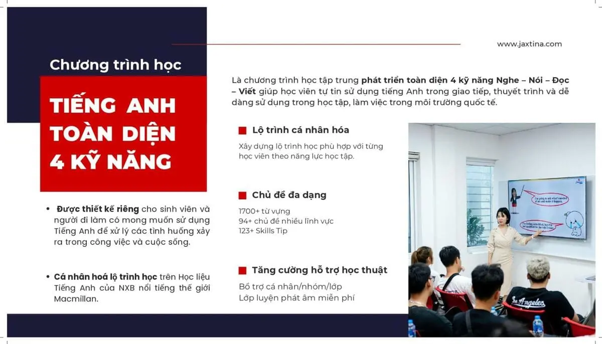 Nếu bạn đang tìm kiếm một địa chỉ uy tín để học phát âm tiếng Anh chuẩn như người bản xứ, Jaxtina chính là lựa chọn đáng tin cậy dành cho bạn. Jaxtina nổi bật với khóa Anh văn giao tiếp 4 kỹ năng – được thiết kế bài bản, giúp người học phát triển đồng đều nghe, nói, đọc, viết và đặc biệt chú trọng vào phát âm chuẩn ngay từ đầu.