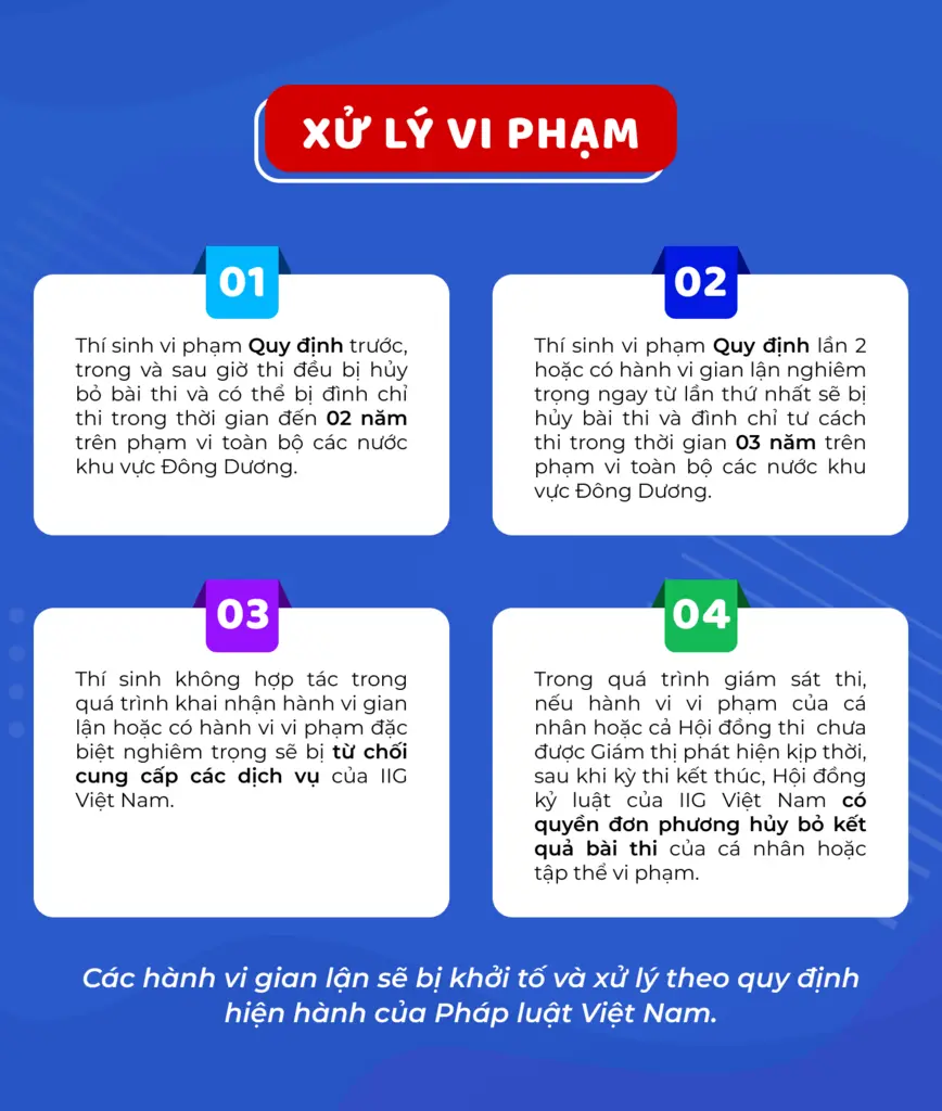 Vi phạm nghiêm trọng (quay cóp, thi hộ, ghi chép nội dung đề) → Hủy bài thi, cấm thi TOEIC trên toàn quốc trong thời hạn từ 1 đến 3 năm.