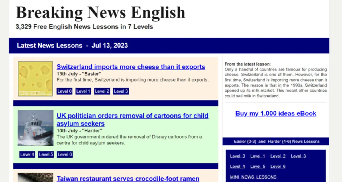 • Breaking News English: Bài đọc theo tin tức thời sự, chia cấp độ rõ ràng, cập nhật thường xuyên.