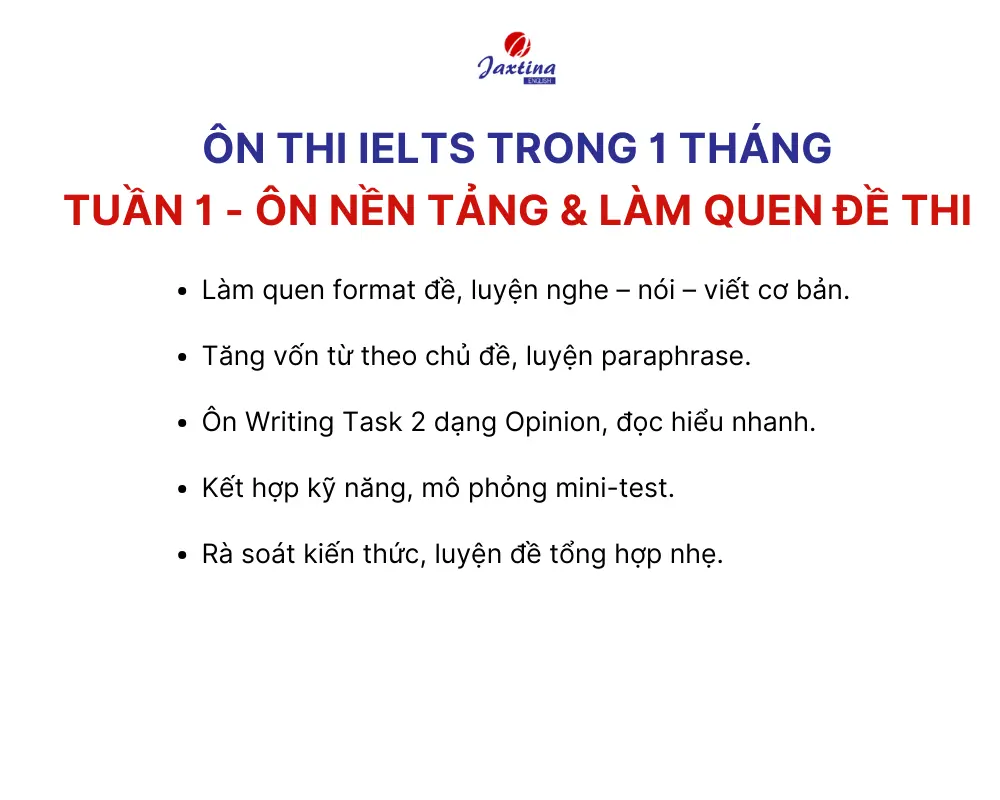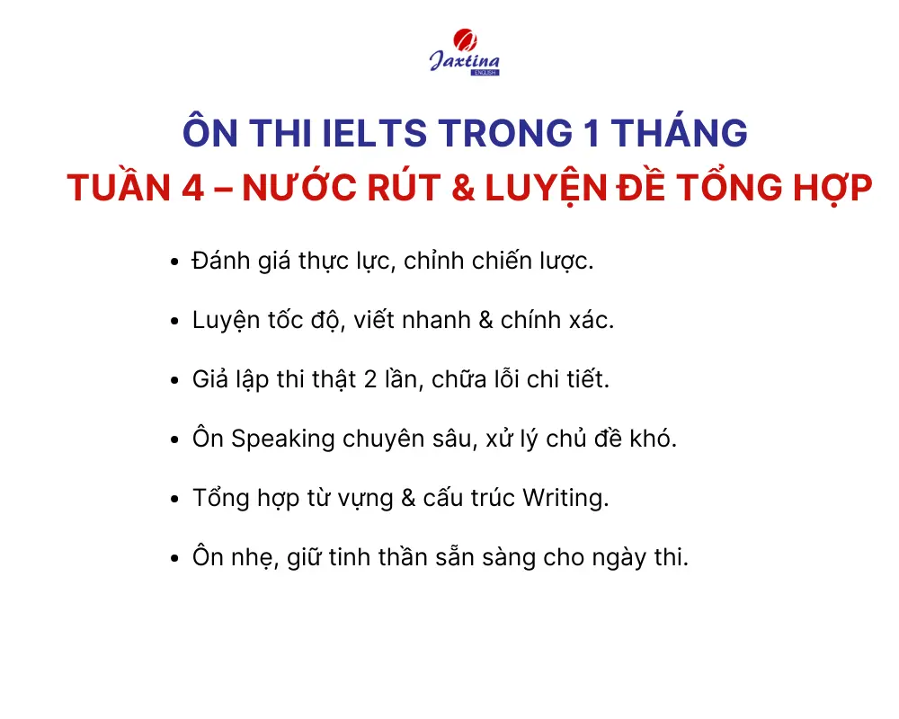 Bạn đang đứng trước kỳ thi IELTS nhưng chỉ còn đúng 1 tháng để chuẩn bị? Bài viết này, Jaxtina sẽ chia sẻ lộ trình luyện, ôn thi IELTS trong 1 tháng chi tiết từng ngày, giúp bạn tận dụng tối đa quỹ thời gian, rèn luyện cả 4 kỹ năng và sẵn sàng bước vào phòng thi với tâm thế tự tin nhất.