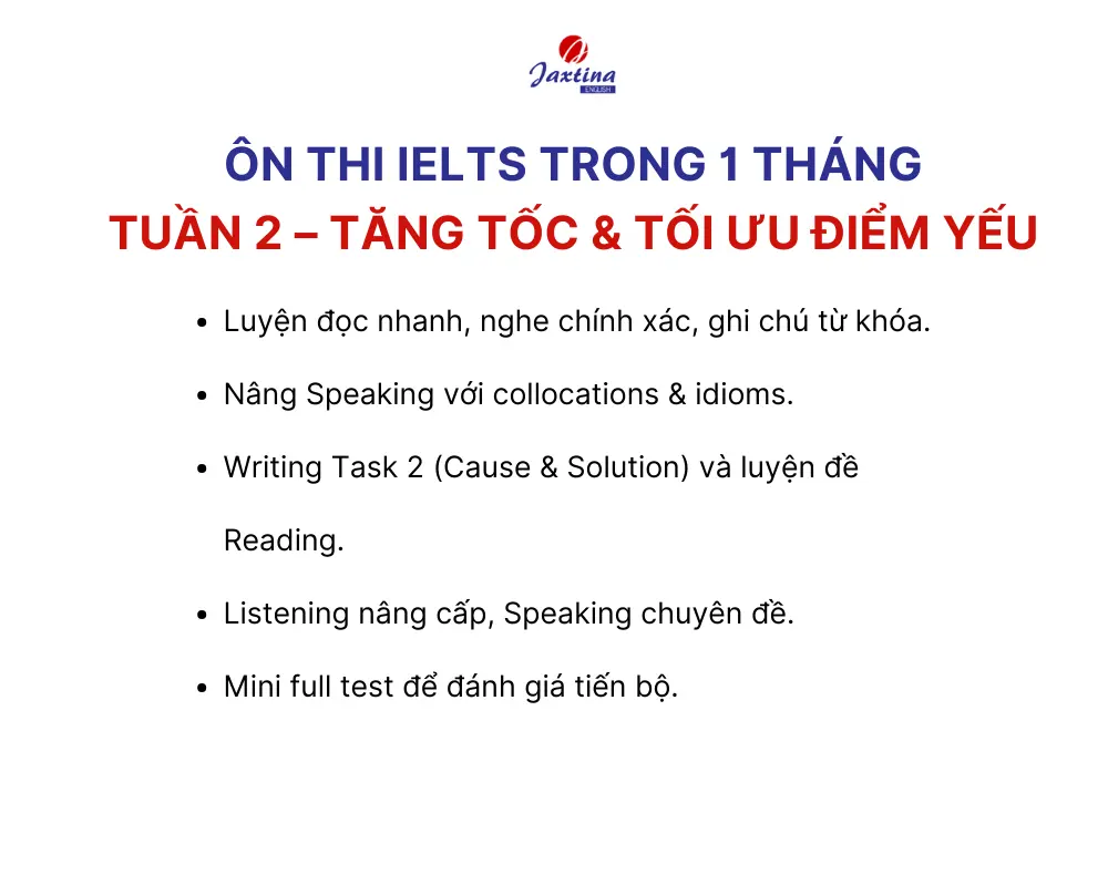 Sang tuần thứ hai khi ôn thi IELTS trong 1 tháng, bạn đã quen với nhịp học và áp lực thời gian, đây là giai đoạn tăng tốc và tối ưu điểm yếu. Mục tiêu là cải thiện độ chính xác, mở rộng vốn từ và luyện phản xạ trong cả 4 kỹ năng.