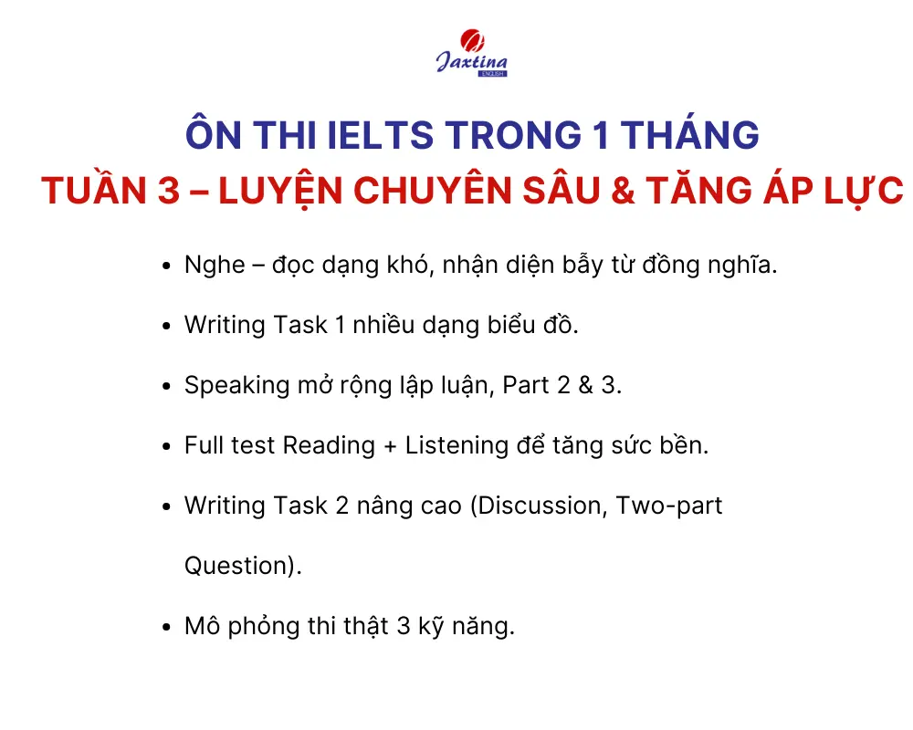 Tuần thứ ba trong lộ trình ôn thi IELTS trong 1 tháng là giai đoạn luyện chuyên sâu và tăng áp lực như thi thật. Lúc này, bạn cần tập trung tối đa vào các dạng đề khó, cải thiện tốc độ làm bài và nâng cao kỹ năng phân tích – triển khai ý tưởng.