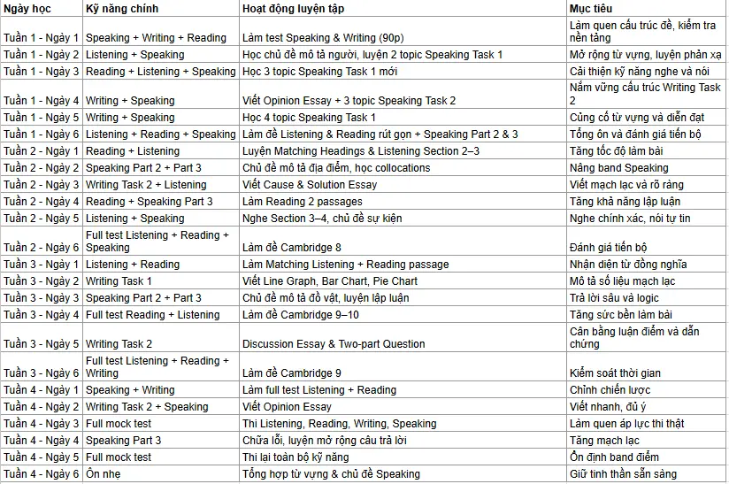 Dưới đây là Bảng lộ trình ôn thi IELTS cấp tốc 1 tháng này được thiết kế khoa học, chia đều thành 4 tuần với mục tiêu rõ ràng cho từng ngày để bạn có thể dễ dàng áp dụng: