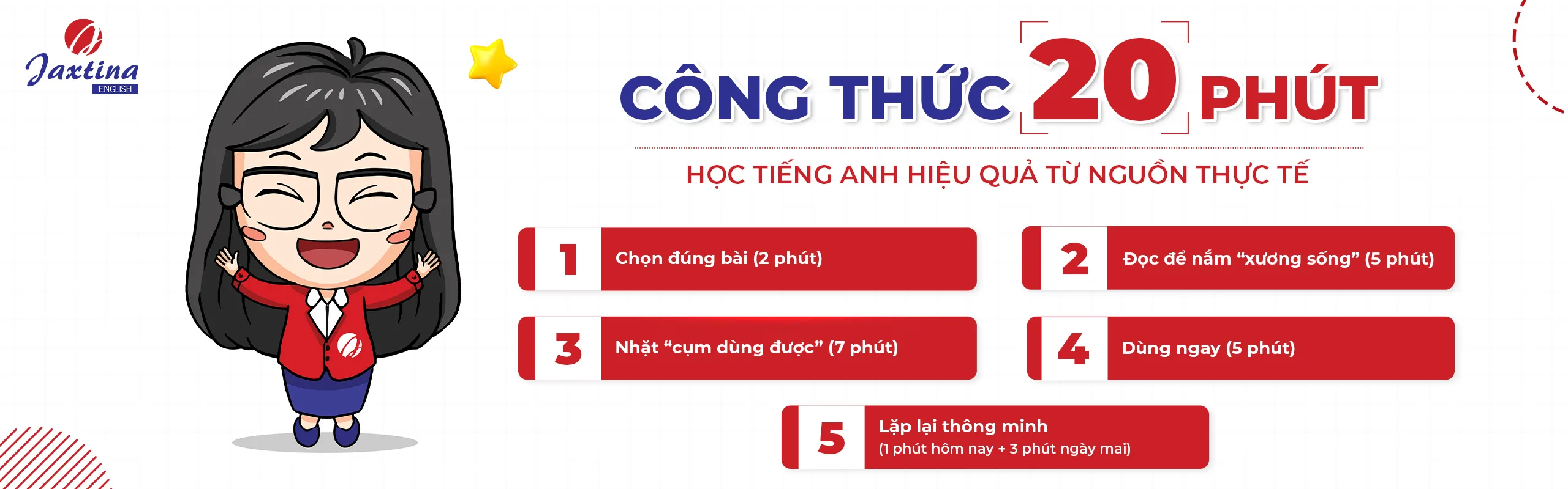 Đừng chỉ dừng lại ở việc “hiểu” nội dung, hãy cùng Jaxtina học cách “dùng” tiếng Anh để tự tin bước ra thế giới với “Công thức 20 phút” học tiếng Anh sau nhé.