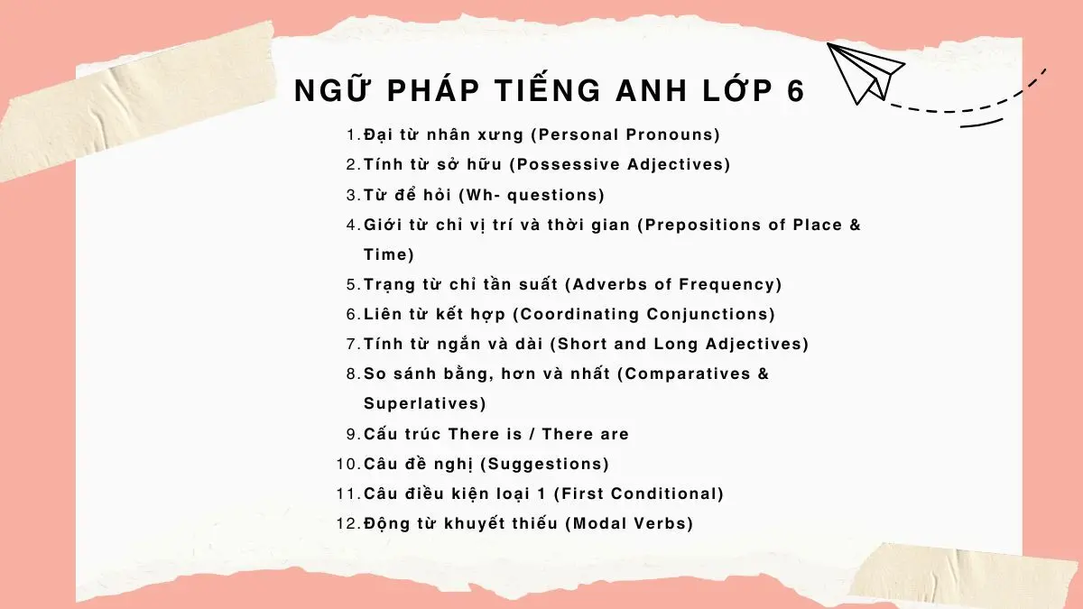 Dưới đây là danh sách 12 điểm ngữ pháp trọng tâm trong chương trình tiếng Anh lớp 6: