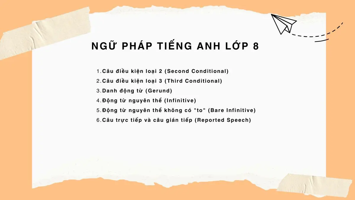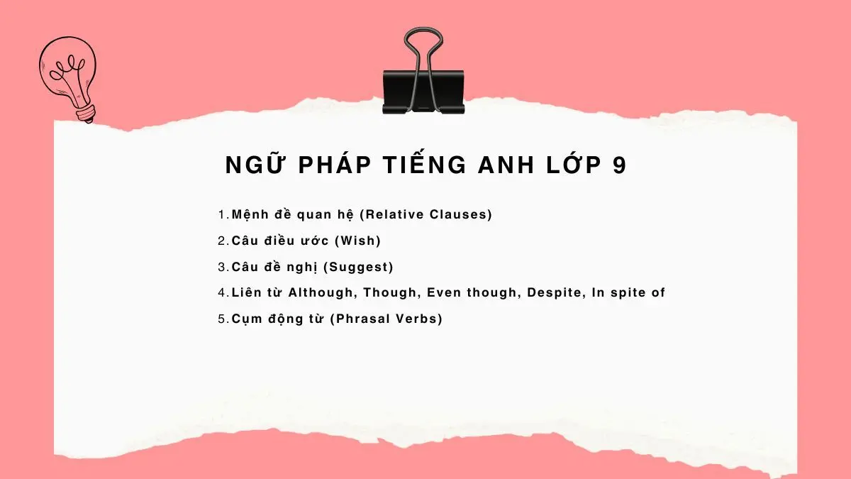 Ngữ pháp tiếng Anh THCS cho khối lớp 9 chủ yếu là ôn lại các kiến thức đã học ở các lớp trước và bổ sung thêm một số kiến thức mới nâng cao, giúp học sinh phát triển khả năng sử dụng tiếng Anh trong nhiều tình huống khác nhau. Các điểm ngữ pháp chính bao gồm: