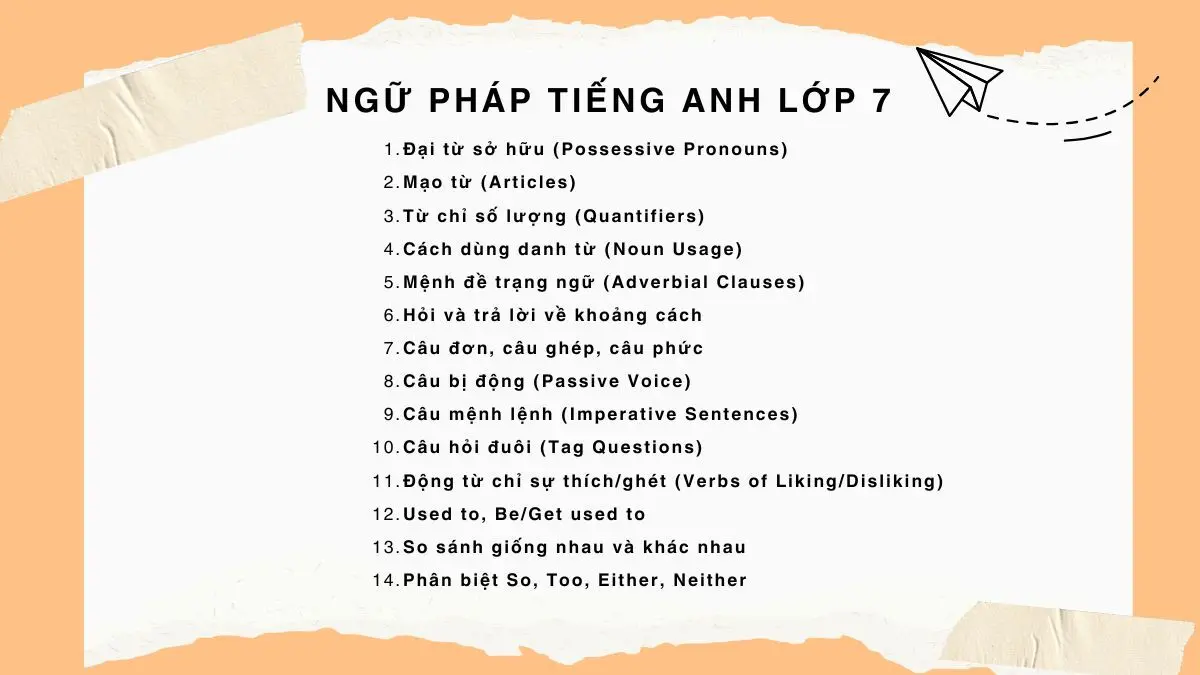 Dưới đây là danh sách 14 điểm ngữ pháp lớp 7: